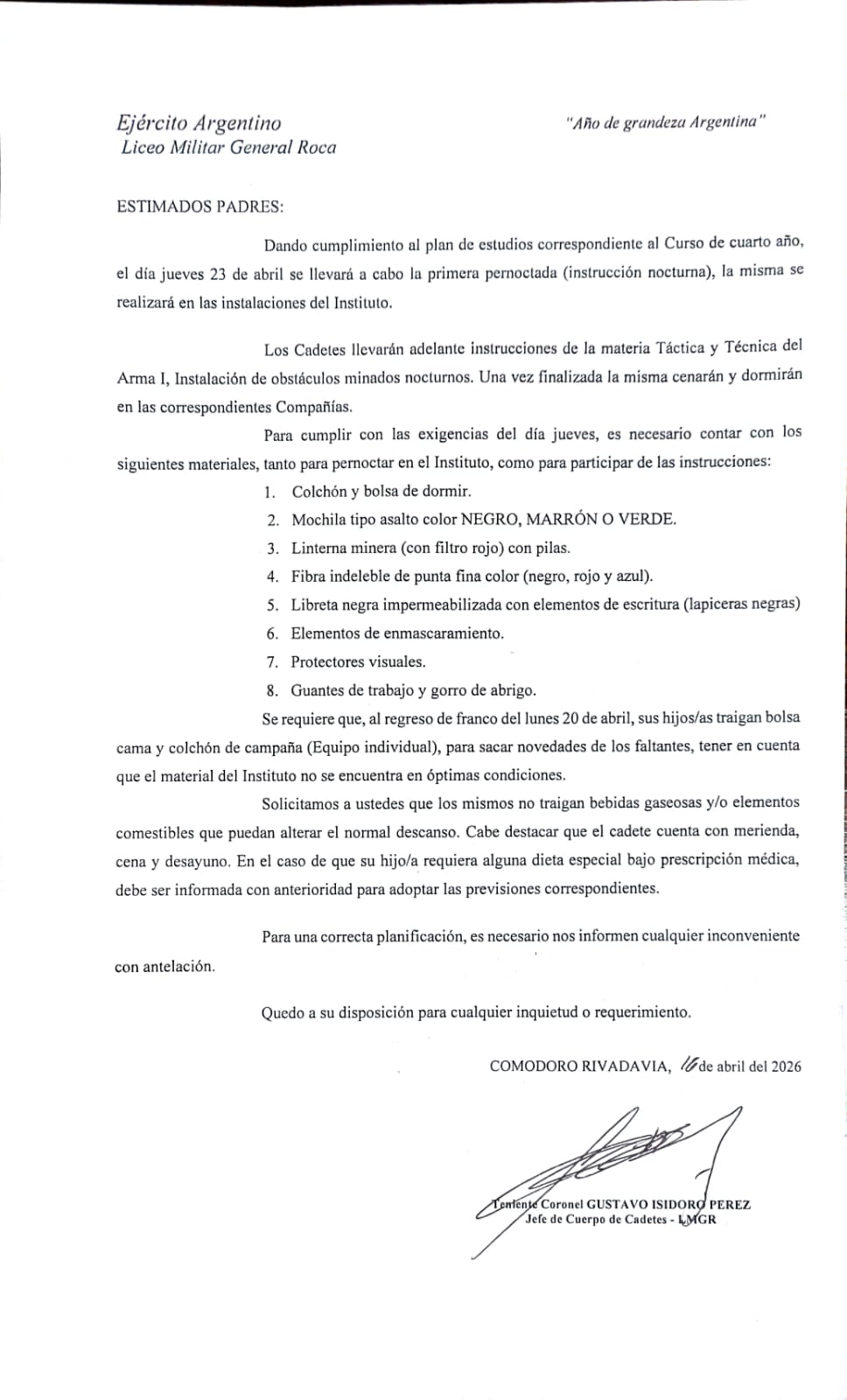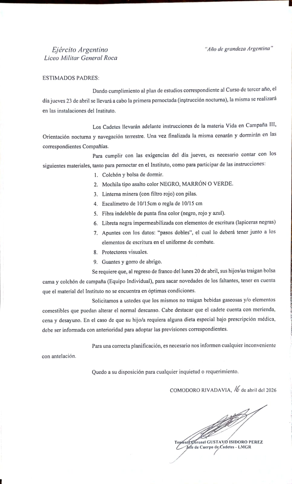 El día viernes 17 de abril de 2026, en la Plaza de Armas “Malvinas Argentinas” de este Instituto, se llevó a cabo una ceremonia en la cual el Director del Liceo Militar General Roca hizo entrega de un distintivo al cadete de 6.º año, quien se hizo acreedor al reconocimiento por su destacado rendimiento personal evidenciado durante su participación en el torneo “Mejor Ingeniero”, correspondiente al año 2025.